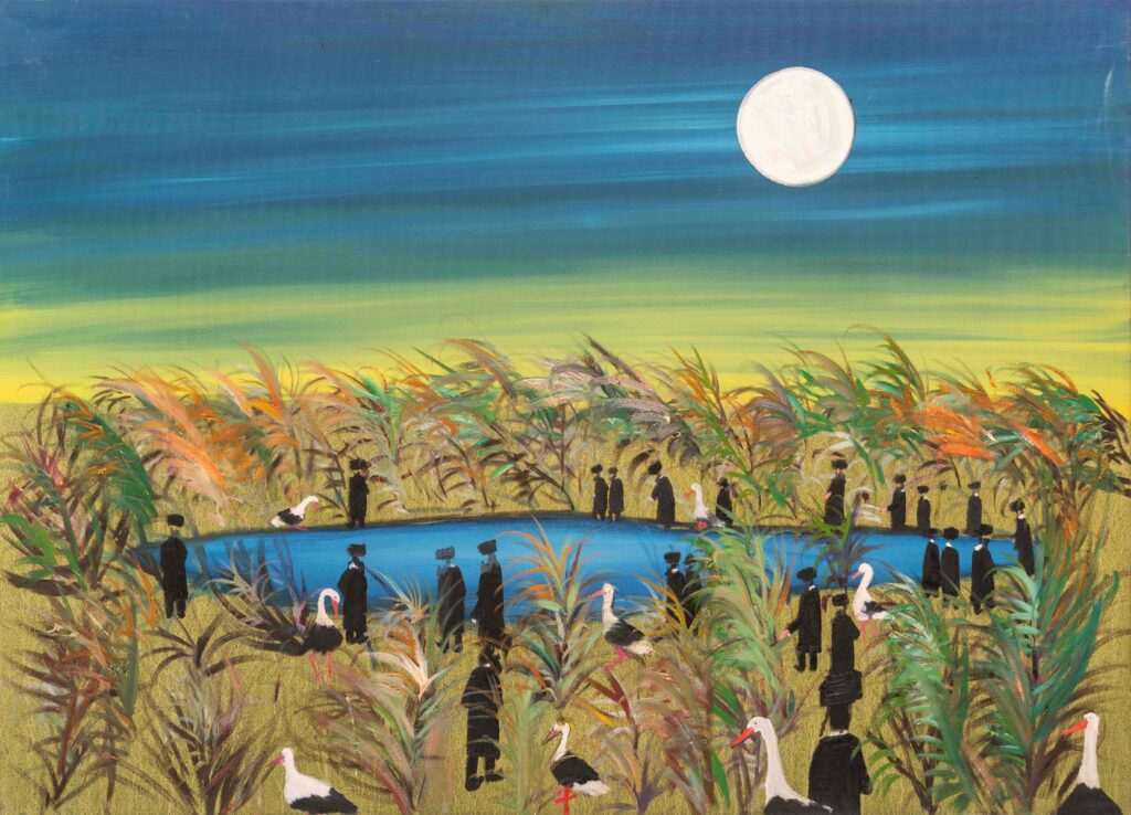 בציורים רבים בתערוכה אפשר לשמוע את פוטנציאל הניגון או השירה שמצוי בקומפוזיציות הצבעוניות, כמו סשן אלתור של כלים רבים. יש עבודות בהן הקולות האלה מוצאים את דרכם גם לסיפור הציורי המתואר: אספן יונים שלומד את שירת הציפורים ושופר בידו, חסיד שעומד אל מול צפרדע מנגנת, מקהלת ציפורים כאוטית אל מול קהל ומנצח ונגן סינתיסייזר עם תרבוש מול להקת קרנפים במדבר שהופך לסוואנה.