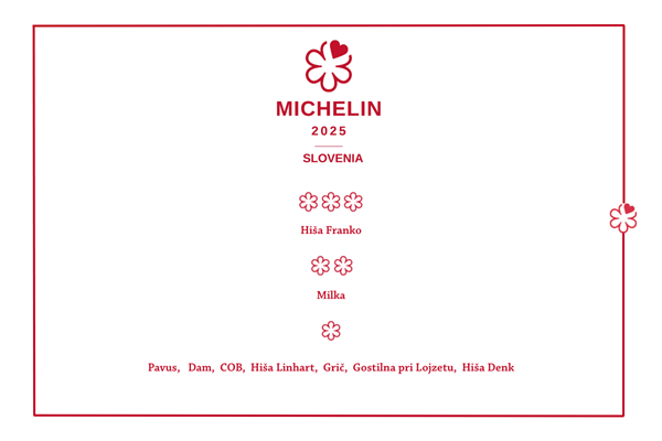 זו השנה השלישית ברציפות, מסעדת מילקה, עם השף דוד ז'פרן (David Žefran), שמרה על מעמדה כשני כוכבים. שבע מסעדות זכו בכוכב מישלן אחד: