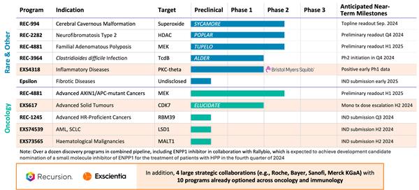 • Partnerships: The proposed business combination would bring together transformational partnerships with leading large pharma companies with a total of 10 programs already optioned across oncology and immunology. In addition to Recursion’s transformational partnerships with Roche-Genentech (neuroscience and a gastrointestinal oncology indication) and Bayer (undruggable oncology), Exscientia has partnerships with Sanofi (immunology and oncology) and Merck KGaA (oncology and immunology). In addition, Exscientia has a partnership with BMS (oncology and immunology) where an optioned program related to PKC-Theta has already shown positive early Phase 1 results. Furthermore, the combined company expects potential additional milestone payments of approximately $200 million over the next 2 years from its current partnerships.